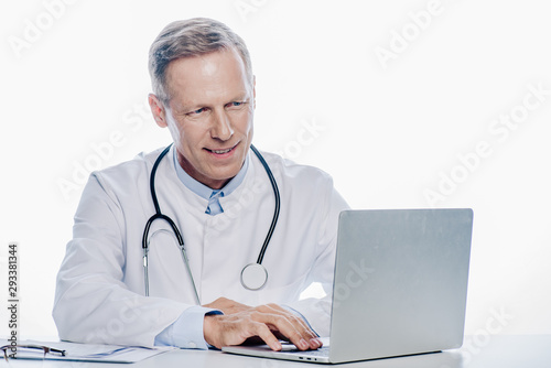 computer, happy, equipment, smiling, happiness, cheerful, caucasian, smile, health, medicine, health care, medicals, man, connection, emotion, doctor, communication, wireless, laptop, stethoscope, emotional, using, profession, photogenic, positive, mature, contraption, typing, medicare, good-looking, professional occupation, isolated on white, copy space, one person, studio shot, middle-aged, white coat