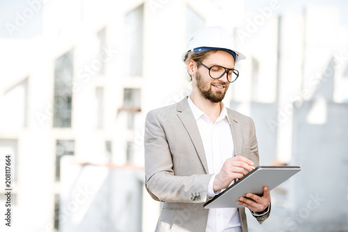 Handsome engineer working with tablet standing on the structure site with a new house on the background