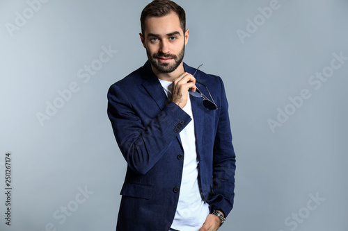 adult, apparel, attractive, background, bearded, casual attire, caucasian, clothes, colours, design, fashion, fashionable, grey, guy, photogenic, hipster, jacket, lifestyle, light, look, male, man, model, modern, outfit, people, person, portrait, posing, style, stylish, sunglasses, trend, trendy, vogue, wear, young