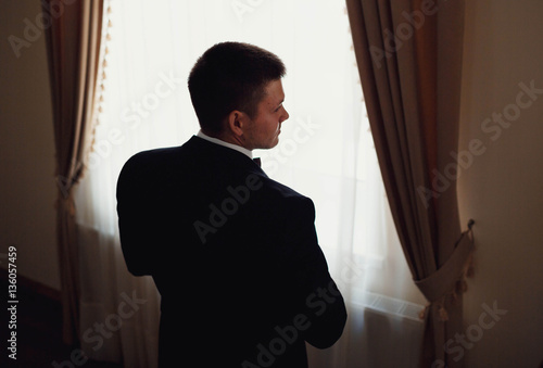 attractive, back, background, black, boy, brunette, business, closeup, clothes, clothing, curtain, day, detail, elegance, elegant, element, event, fashion, formal, groom, guy, hand, photogenic, holiday, home, husband, isolated, jacket, light, luxury, male, man, marriage, modern, morning, outdoors, person, preparation, room, shirt, style, stylish, suit, tailor, wearing, wedding, white, window
