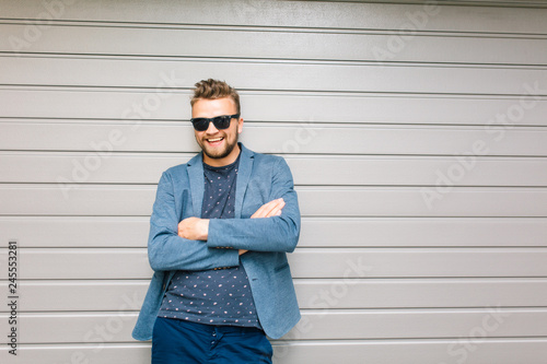 Handsome guy is posing on gray wall background. He wears gray jacket, T-shirt, jeans, sunglasses. He is smiling to the camera.