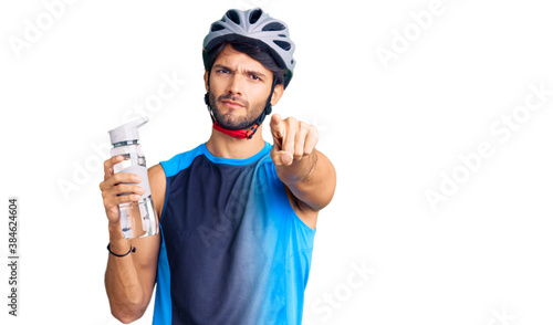 Handsome hispanic man wearing bike helmet and holding water bottle pointing with finger to the camera and to you, confident gesture looking serious