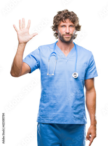 Handsome hispanic surgeon doctor man over isolated background showing and pointing up with fingers number five while smiling confident and happy.