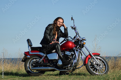 Handsome long-haired biker in the leather on red motorcycle against field and seashore. Brutal man in leather