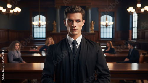 Handsome male lawyer wearing suit inside of courtroom, ready to defend client in our legal justice system