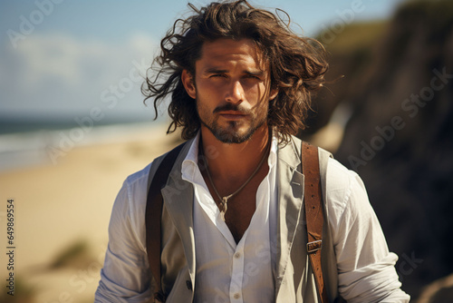 lifestyle, man, beach, photogenic, old, escapism, summer, style, free, spirit, beautiful, flower child, sand, sunny, day, portrait, sunlight, background, outdoors, bohemian, hair, long hair, male, travel, hipster, charming, coast, coastline, sea, outfit, canyon, sun, casual attire, escape, stylish, vacation, clothes, curly, dune, fashionable, coiffure, man, sexy