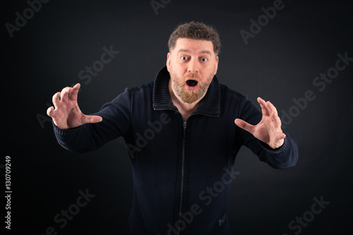 adult, black, black background, brown hair, casual attire, cheerful, content, cool, enjoyment, excitement, facial expression, fun, grey, happiness, human face, human hand, joy, male, man, mouth open, one man only, one person, people, shock, smiling, studio shot, surprise, beard, big, caucasian, fat, large, obesity, stupefaction
