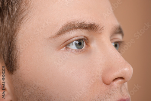 Handsome man on beige background, closeup view