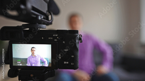 Handsome man recording his videoblog at home.