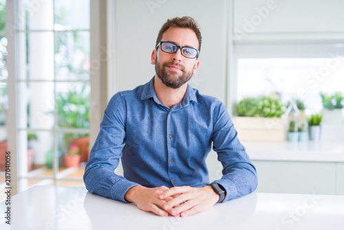 Handsome man wearing glasses and smiling relaxed at camera
