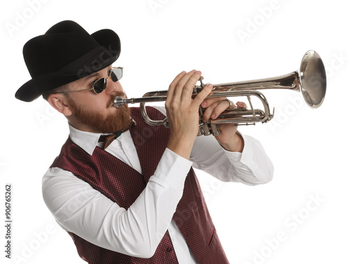 adult, art, artist, background, beard, blowing, blues, brass, caucasian, classic, concert, entertainment, equipment, festival, guy, photogenic, hat, hobby, instrument, isolated, jazz, lifestyle, male, man, melody, metal, music, musical, musician, occupation, orchestra, party, performance, performer, person, play, player, playing, portrait, professional, sound, style, symphony, talent, trumpet, trumpeter, white, wind