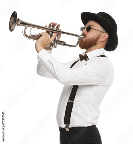 adult, art, artist, background, beard, blowing, blues, brass, caucasian, classic, concert, entertainment, equipment, festival, guy, photogenic, hat, hobby, instrument, isolated, jazz, lifestyle, male, man, melody, metal, music, musical, musician, occupation, orchestra, party, performance, performer, person, play, player, playing, portrait, professional, sound, style, sunglasses, symphony, talent, trumpet, trumpeter, white