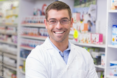 man, male, caucasian, medicine, apothecary, pharmacy, treatment, care, ill, disease, medicals, hospital, clinic, drug, medicine, storage, pharmaceutical, pharmaceutic, chemist's shop, happy, smiling, cheerful, portrait, labcoat, photogenic, eyeglass, indoor