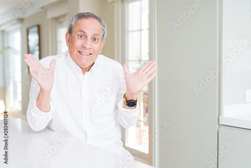 Handsome senior man at home celebrating mad and crazy for success with arms raised and closed eyes screaming excited. Winner concept