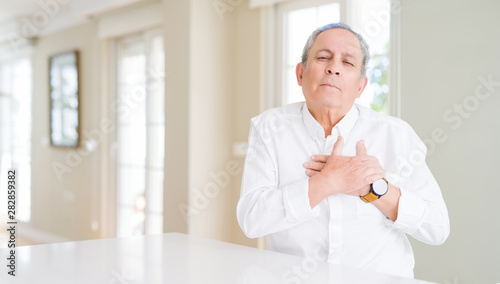 Handsome senior man at home smiling with hands on chest with closed eyes and grateful gesture on face. Health concept.