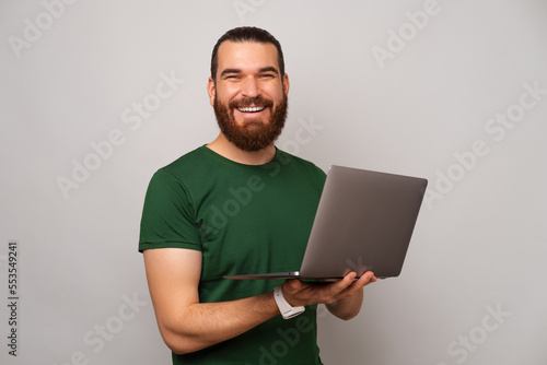 beard, portrait, laptop, hold, man, apply, study, connection, login, type, search, browse, texting, writer, using, business, keyboard, freelance, work, notebook, online, computer, cyberspace, communication, hipster, bearded, brunette, male, guy, photogenic, one person, caucasian, brown hair, 30s, closeup, copy space, young, ecstatic, exhilaration, smile, happiness, cheerful, positive, studio, indoor