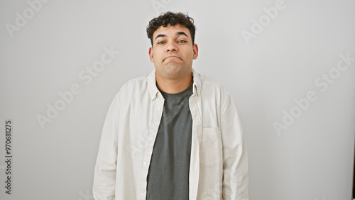 man, young, photogenic, beard, adult, casual attire, standing, white, isolated, background, portrait, male, person, fashion, modern, style, confident, expression, shirt, ethnic, diverse, lifestyle, photo, studio, individual, neutral, wall, cut-out, solo, 1, look, face, curly, hair, brown, eye, serious, youth, attire, natural, simplicity, clean, latin, arabic, hispanic, middle, eastern, fashionable, smart