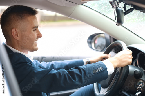 Handsome young businessman driving modern car