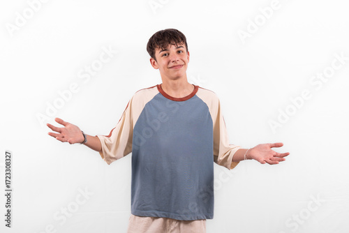 teenage, boy, uncertain, uncertain, shrug, clueless, photogenic, smiling, expressing, negative space, male, white, caucasian, teenage, teenage, model, expression, young, positive, happy, isolated, casual attire, smile, studio