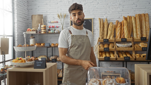 Handsome, young, hispanic man with a beard standing in a bakery shop, surrounded by fresh pastries and bread, wearing an apron, looking at the camera.