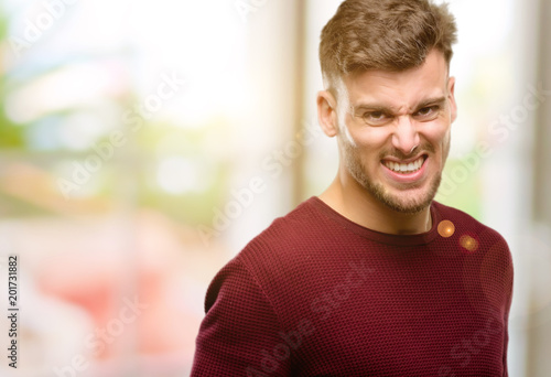 Handsome young man angry and stressful frowns face in dissatisfaction, irritated and annoyed, expressing anger