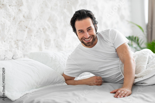 Handsome young man laying in bed, waiting for his lady
