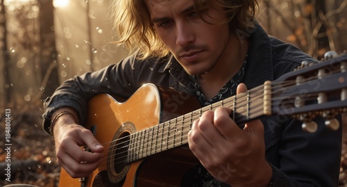 handsome man, young men, acoustic guitar, forest, sunlit, outdoors, performer, music, guitarist, nature, tree, sunlight, wood, portrait, candid, daytime, idylli, serene, peaceful, melody, song, strumming, musical instrument, singer, guitarist, lifestyle, concert, performance, harmony, golden hour, warm light, artist, musician, tranquil, captivating, creative, authentic