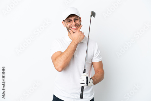 adult, background, blond, club, confident, crossed, curly, drive, expression, face, fun, game, golfer, golfing, happiness, iron, isolated, laughing, leisure, life, lifestyle, male, man, man, people, person, play, player, portrait, pose, positive, pro, professional, smile, smiling, sport, style, tournament, white, young, golf, happy