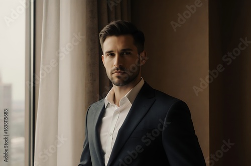 man, model, male, young, adult, photogenic, attractive, stylish, fashion, portrait, outdoors, urban, city, street, suit, jacket, shirt, white shirt, business, professional, serious, confident, intense, gaze, expression, window, curtain, view, city landscape, building, background, lighting, shadow, dark, brown, neutral, texture, fabric, collar, buttons, clean-cut, coiffure, beard, facial hair, composition, photo