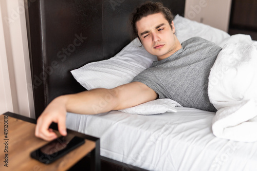 Handsome young man waking up with mobile alarm clock
