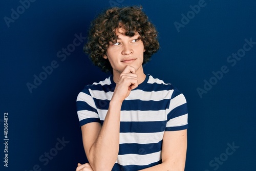 Handsome young man wearing casual striped t shirt with hand on chin thinking about question, pensive expression. smiling with thoughtful face. doubt concept.