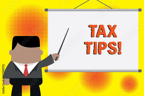Handwriting text writing Tax Tips. Conceptual photo compulsory contribution to state revenue levied by government Businessman standing in front projector screen pointing project idea