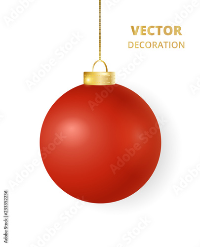 Hanging red Christmas ball. Mat gloss metal bauble, holiday decoration.