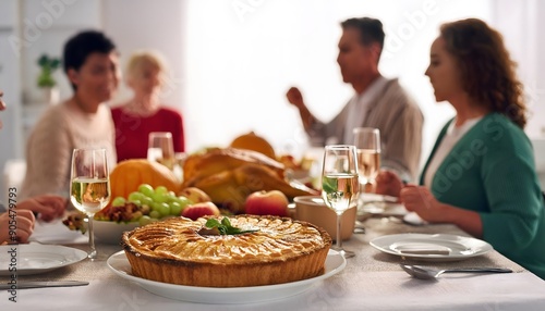 hanksgiving family dinner. Traditional apple pie and vegan meal close up, with blurred happy people around the table celebrating the holiday.