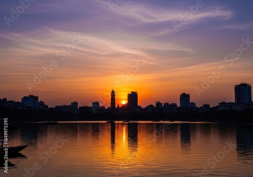 Hanoi skyline reflecting on tranquil lake during a radiant sunset