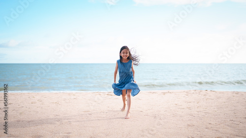 Happy and healthy asian little girl is running on the beach with happy moment for holiday vacation time. Concept of travel, nature, outdoor activity for kid.