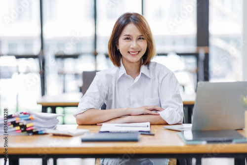 Happy asian business woman entrepreneur in office using laptop at work, smiling professional female company executive wearing suit working on computer at workplace.