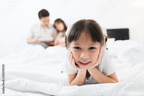 Happy Asian family moments featuring a cheerful daughter excitedly waiting for her new sibling; parents lovingly observe her, embracing the joy of family bonding and motherhood.