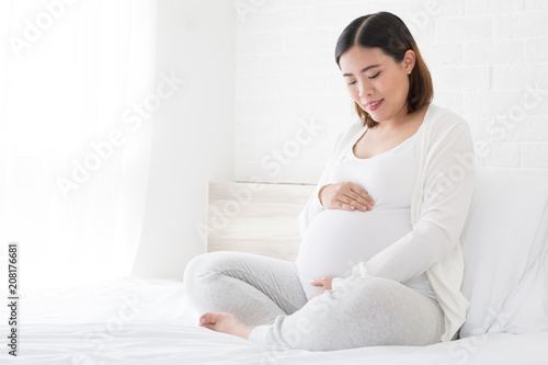 Happy asian pregnant woman sitting on bed and touching her belly at home