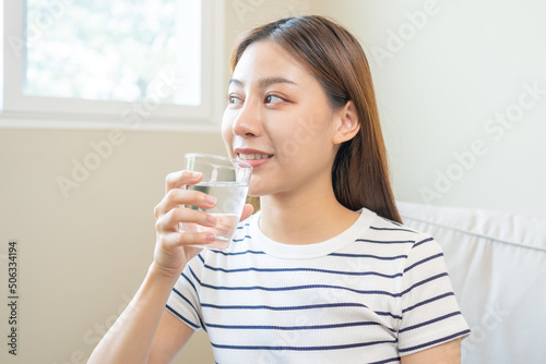 Happy beautiful, asian young woman, girl drinking, sip fresh glass of water for hydration of body, holding transparent glass in her hand, thirsty at home. Health care, healthy lifestyle concept.