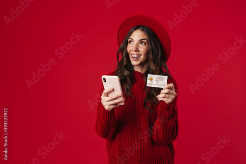 cheerful, woman, people, girl, mobile phone, smartphone, mobile, phone, card, credit, debit, cashless, holding, using, smiling, happy, joyful, young, caucasian, brunette, hat, isolated, red, background, copy space