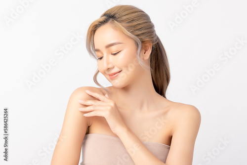 Happy beautiful young asian woman clean fresh bare skin concept. Asian girl beauty face skincare and health wellness, Facial treatment, Perfect skin, Natural make up. Isolated on white background.