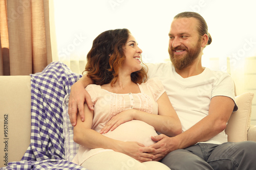 Happy beloved couple in waiting for baby's birth on sofa in the room
