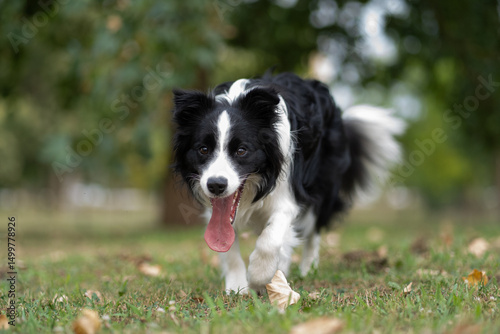 Happy black and white border collie dog runs through grassy park on a sunny day