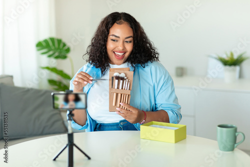 Happy black body positive blogger woman showing cosmetic brushes and filming on smartphone
