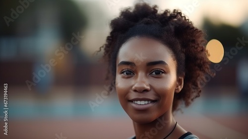 Happy black woman, tennis and professional on court ready for match, game or outdoor sport. Face of African female. Sport concept. Tennis concept. Portrait concept