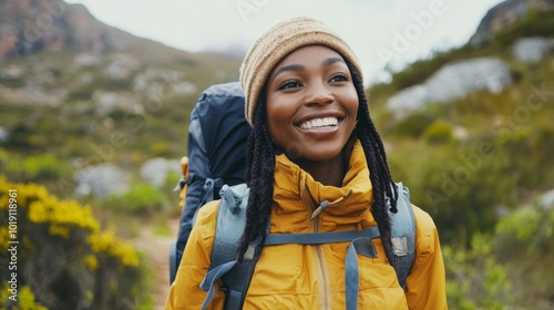 Happy black woman walking in mountains with backpack, close up shot, conquering peaks or healthy lifestyle and travel