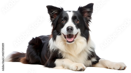 Happy border collie dog lying down with its mouth open and tongue out, isolated on transparent background