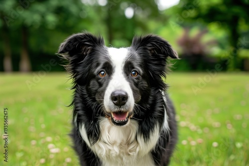 Happy border collie enjoying a sunny day in a lush green park with a cheerful expression and playful energy