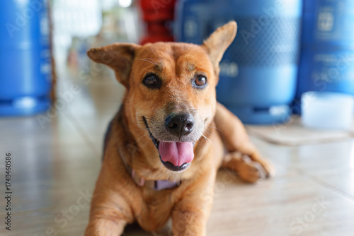 Happy brown dog lying on floor with tongue out and relaxed posture